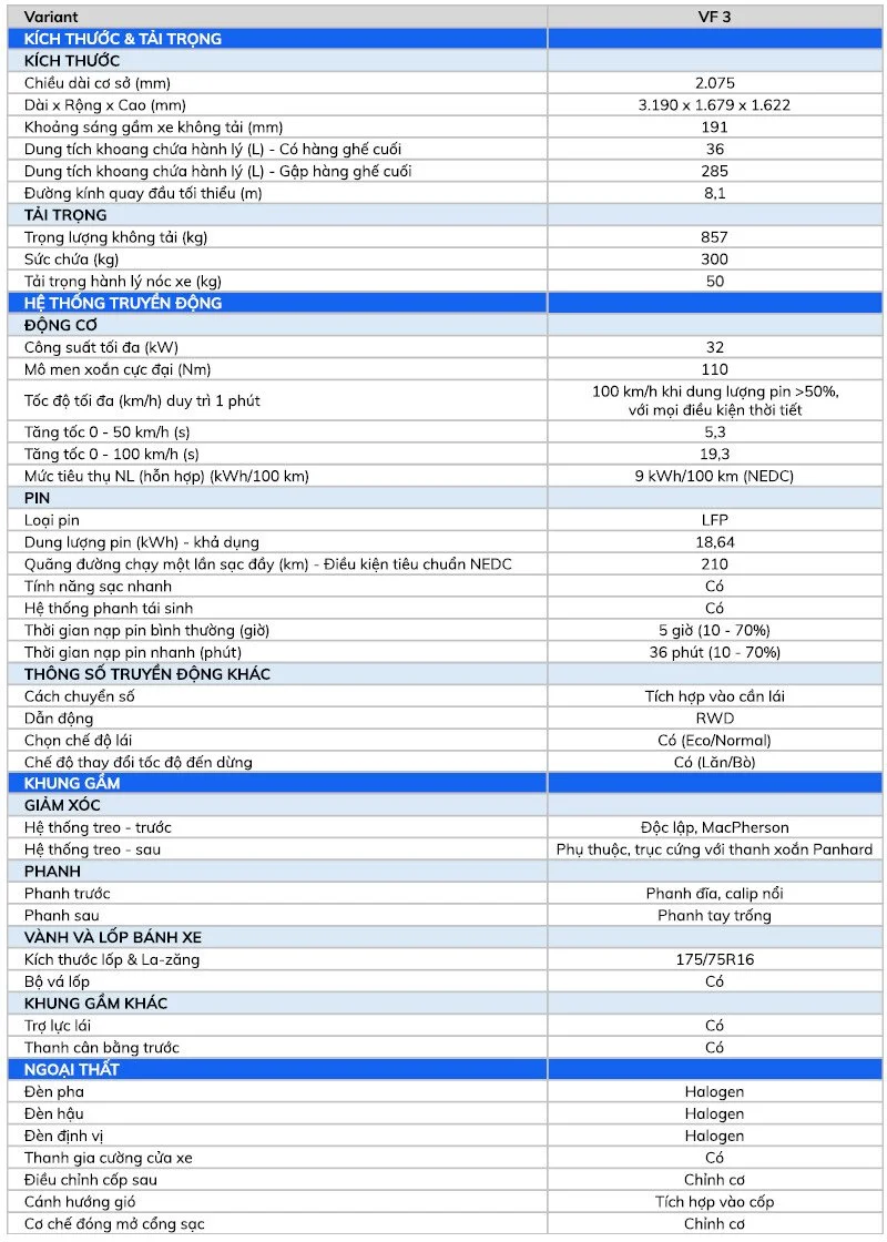 Một số thông số kỹ thuật ấn tượng của VF3: